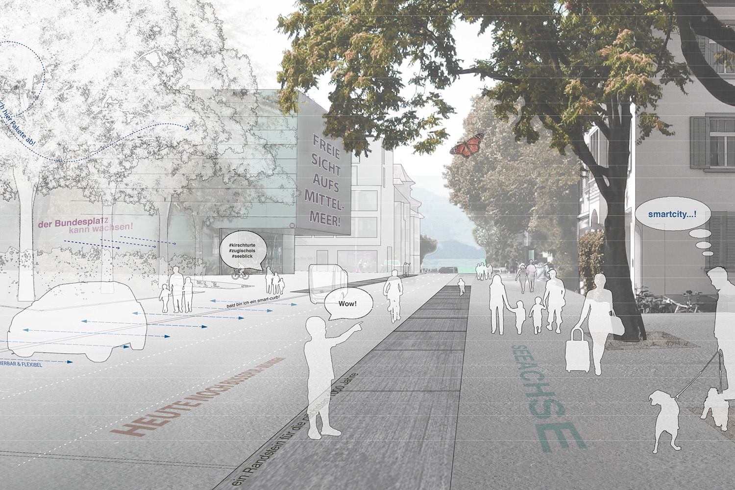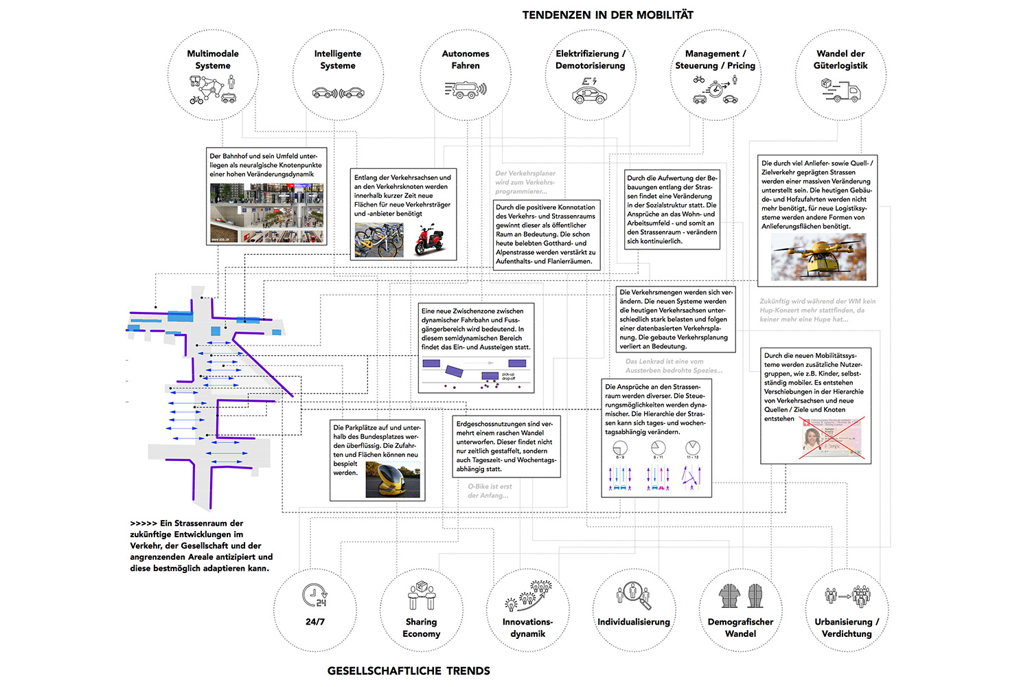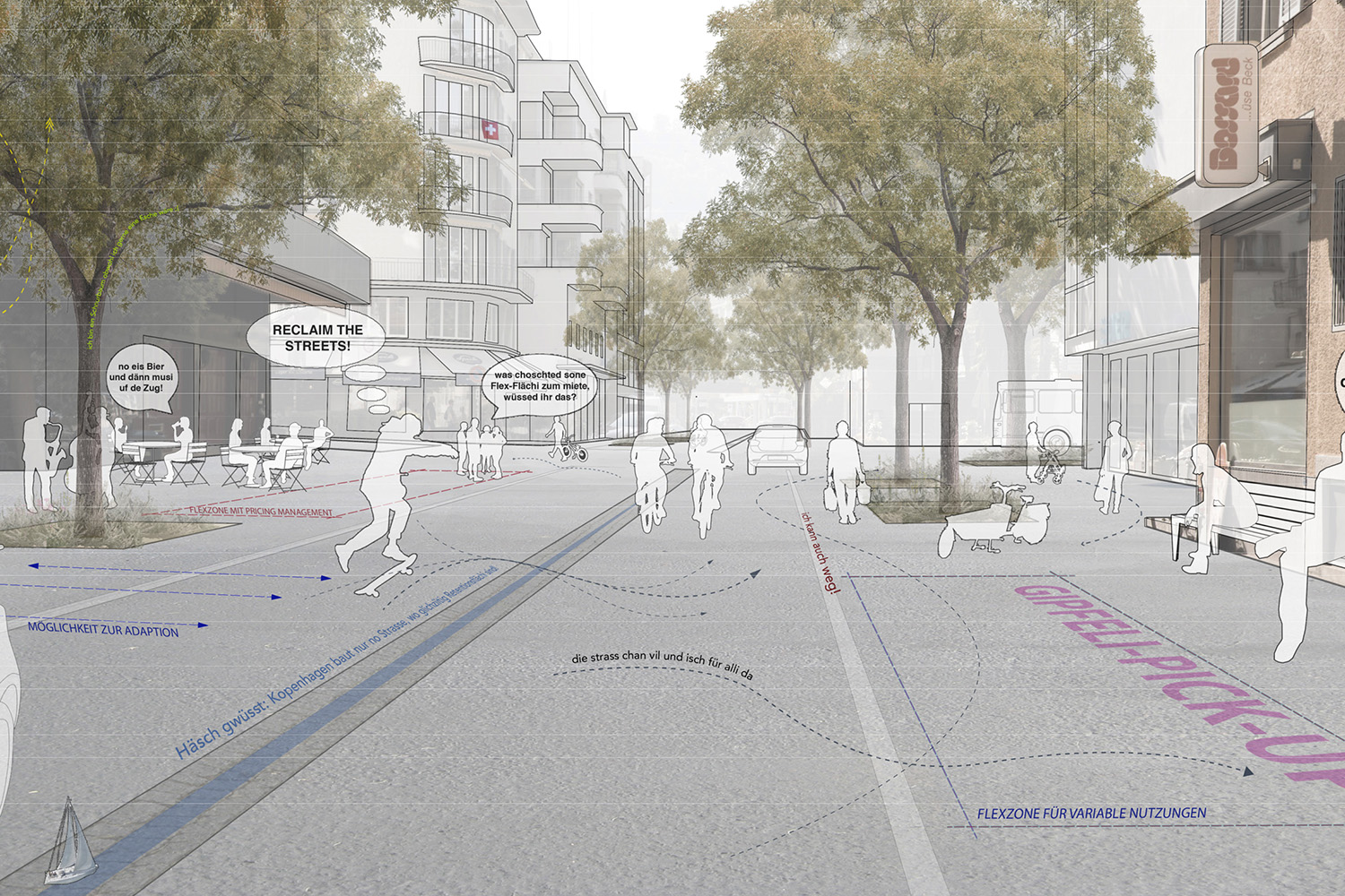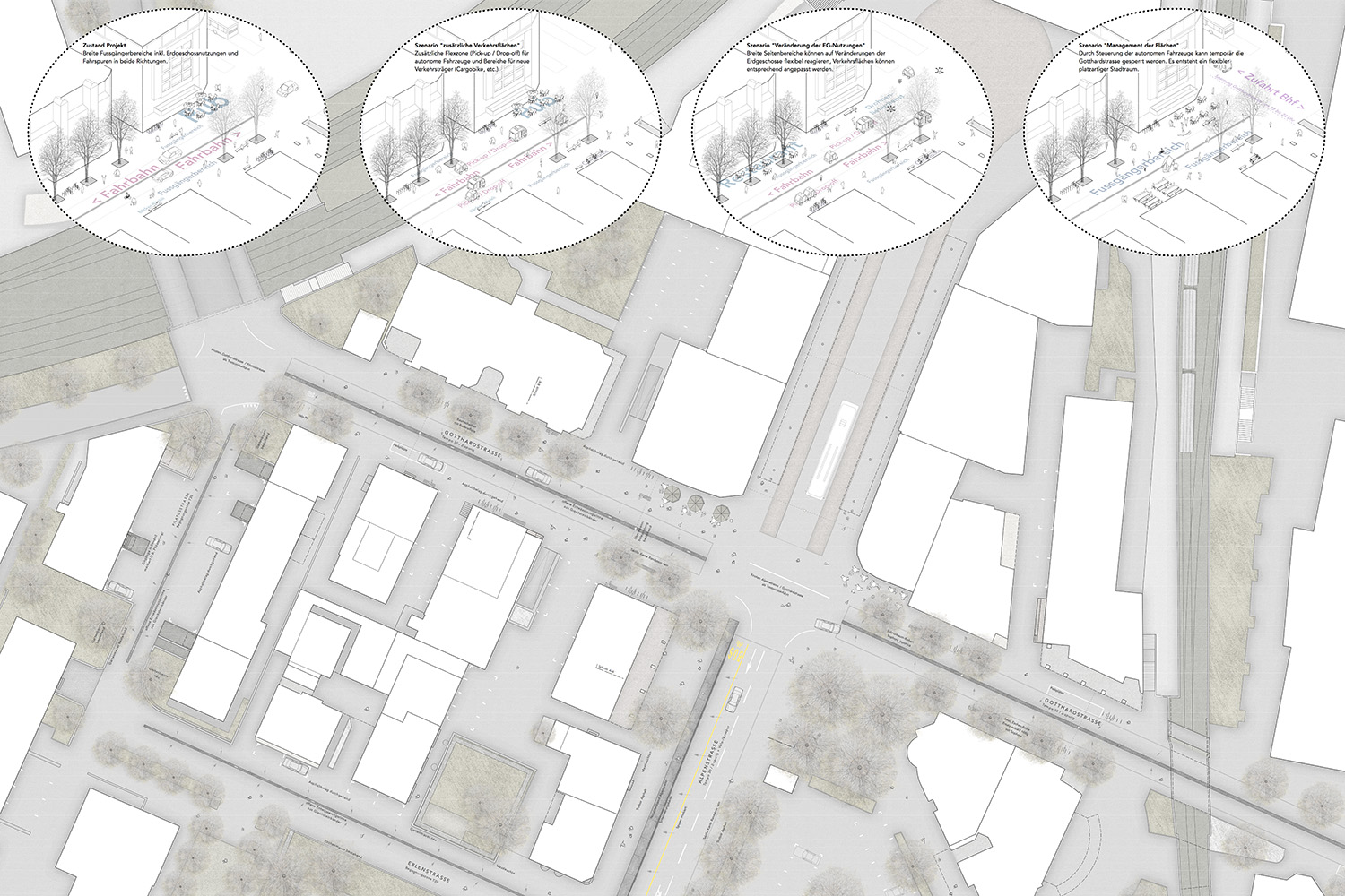 Mit ihrem Beitrag gehen die Verfassenden weit über den üblichen Rahmen der Aufgabenstellung hinaus. Sie beschäftigen sich insbesondere mit dem Wandel der Mobilität im Licht gesellschaftlicher Trends und die daraus folgenden Verhaltensveränderungen der Stadtraumnutzenden. Daraus ergibt sich für den öffentlichen Raum eine deutlich veränderte Programmierung. Die sich ergebenden Schlüsse werden plausibel in ein Gesamtkonzept verwoben. Das Freihalten grosser Teile des Stadtraumes zugunsten möglicher Entwicklungen ist konzeptionell nachvollziehbar. Insgesamt ist der Beitrag sehr bemerkenswert, formuliert er doch Entwicklungsprozesse, die für die künftige Stadtentwicklung Massgabe sein werden (Auszug aus dem Jurybericht).