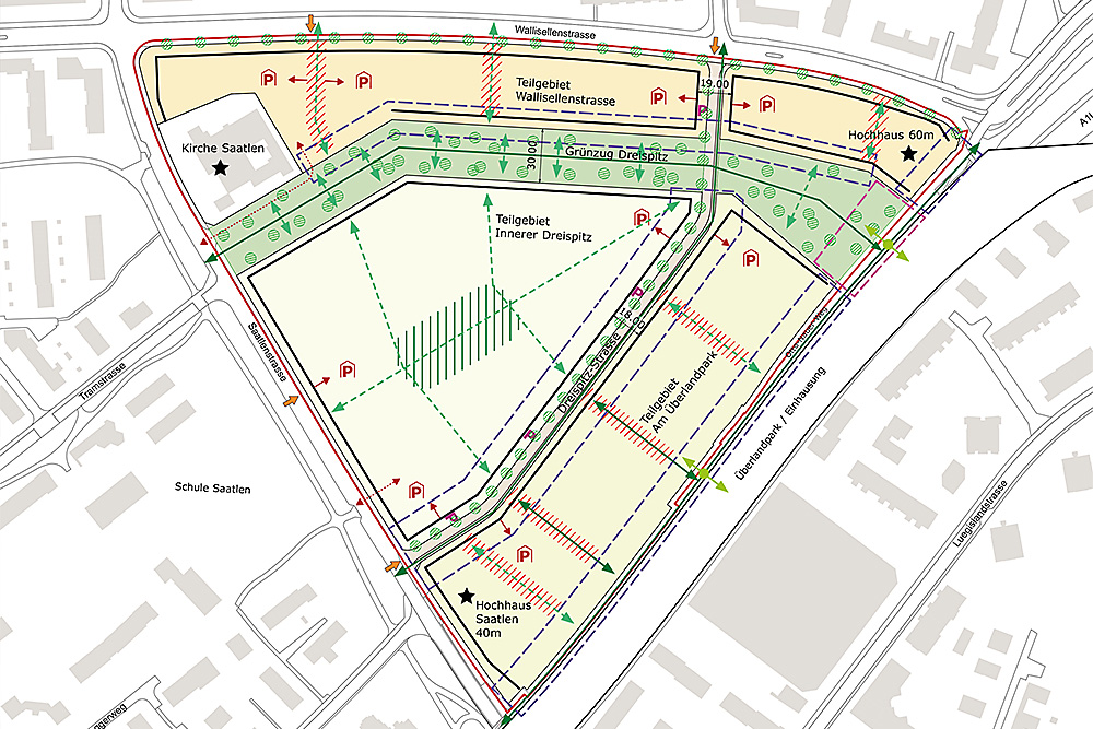 Für die Umsetzung der mit dem Masterplan festgelegten Entwicklungsabsichten liegen den Teilgebieten unterschiedliche planungsrechtliche Rahmenbedingungen zu Grunde. Im Teilgebiet "Am Überland" ist der öffentliche Gestaltungsplan Überlandpark massgebend. Über die Teilgebiete Innerer Dreispitz und Wallisellenstrasse sowie den Grünzug wurde ein privater Gestaltungsplan erarbeitet. Parallel dazu wurden im privaten Quartierplan die neue Erschliessung der Grundstücke und die grundbuchrechtlichen Vereinbarungen geregelt. Die Planungsinstrumente auf den 1. Oktober 2022 in Kraft gesetzt worden.