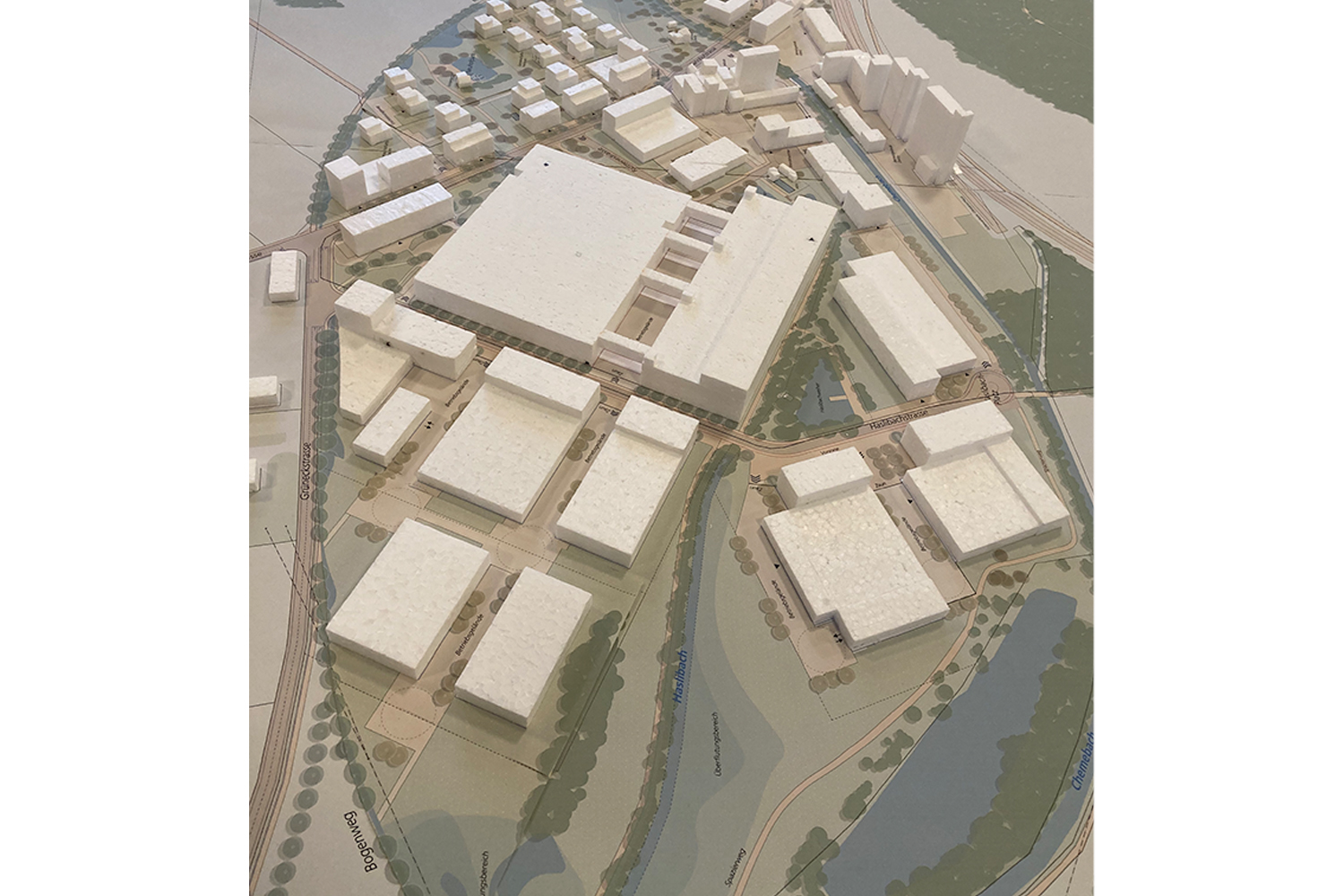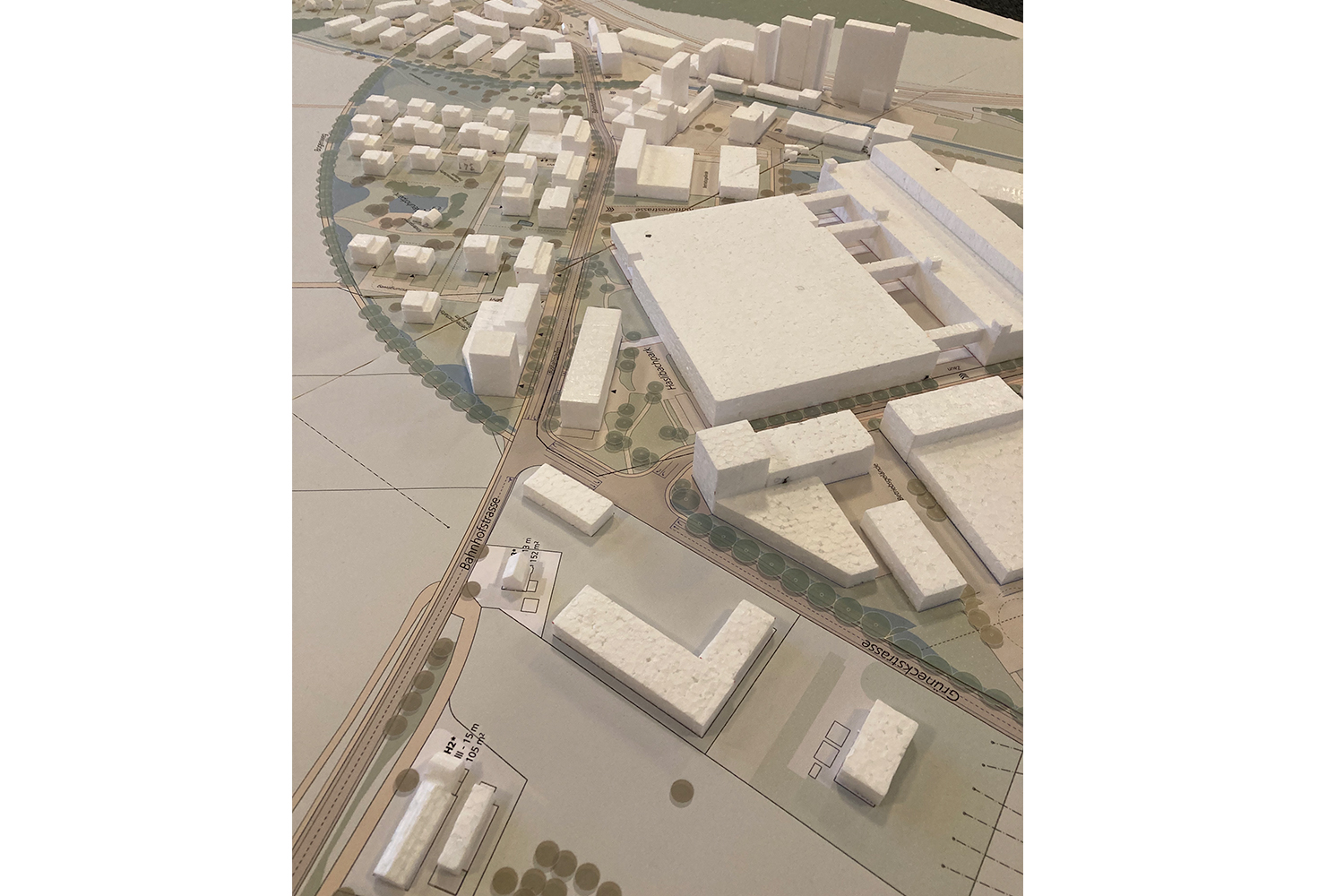 Arbeitsmodell: Blick zum Quartier Bahnhof mit Industriepark und Quartier Neuhof im Hintergrund
