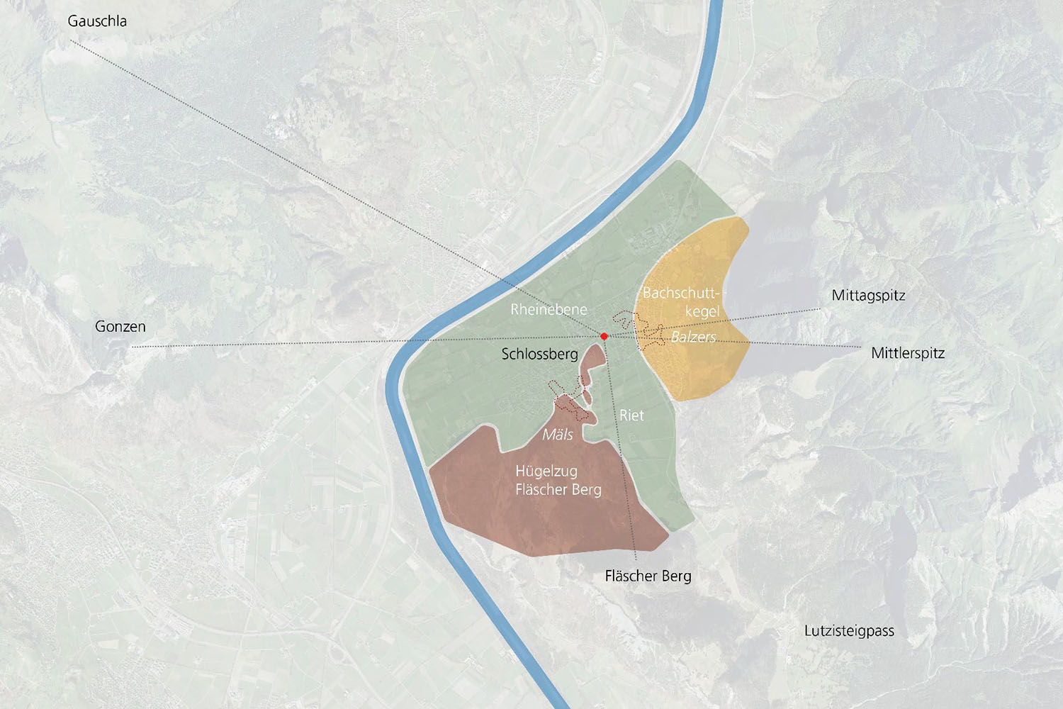 Im Verständnis, dass das Dorfzentrum inmitten der Landschaft der Rheinebene liegt, wird das Zentrum konsequent aus der Lektüre der Landschaft(en) entwickelt. Primär greift die strukturierte Fläche des Riets, durch den Friedhof inselartig gartenhistorisch überformt, zungenartig bis zum Gemeindesaal und Primarschulhaus vor. Aufgrund der Überformungen wird dieser Bereich als eine Art Landschaftspark für das Promenieren und die Erholung verstanden und in diesem Sinne konzeptionell bearbeitet. Östlich angrenzend liegt der repräsentative öffentliche Dorfplatz, aufgespannt zwischen dem aufgewerteten Gemeindesaal und der neuen Gemeindeverwaltung (Etappe 2). Wiederum östlich grenzt der funktional gestaltete Festplatz an.