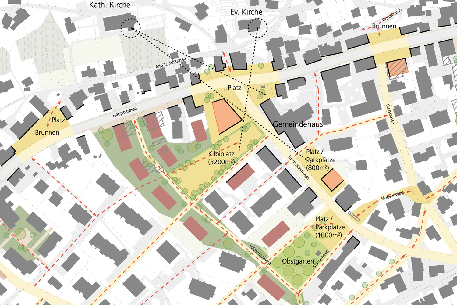 Der Prozess wurde durch drei Workshops mit dem Gemeinderat strukturiert und Inhalte der Studie wurden im Rahmen einer öffentlichen Informationsveranstaltung vorgestellt und diskutiert. Sowohl die Inhalte der ortsbaulichen Studie als auch des Entwicklungskonzeptes werden aktuell in einen kommunalen Richtplan übersetzt.