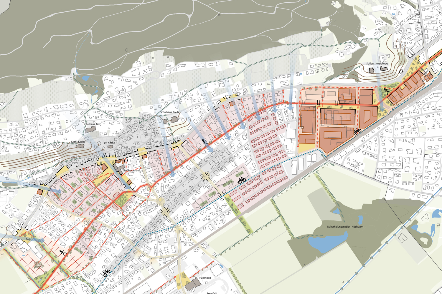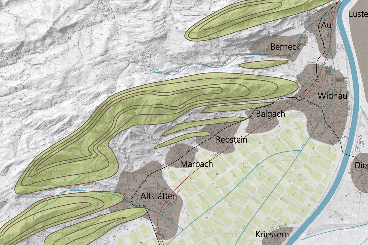 Die ortsbauliche Studie reflektiert diese Fokusgebiete kritisch und untersucht konkrete bauliche und freiräumliche Entwicklungsperspektiven. Ergänzend zur baulichen Entwicklung werden neue öffentliche Frei- und Grünräume lokalisiert und gestalterische Ansätze aufgezeigt. Dies beinhaltet sowohl neue Freiflächen in Entwicklungsgebieten als auch die Stärkung linearer Freiraumelemente entlang wichtiger Bewegungsräume. Zudem wird ein Ansatz zur ortsbaulichen, "szenografischen" Gliederung der Ortsdurchfahrt aufgezeigt. Der im St. Galler Rheintal wichtige Aspekt der hitzeangepassten Siedlungsentwicklung wird mit strukturell-ortbaulichen Massnahmen, in der Gestaltung der Freiräume sowie mittels allgemeiner Massnahmen behandelt.