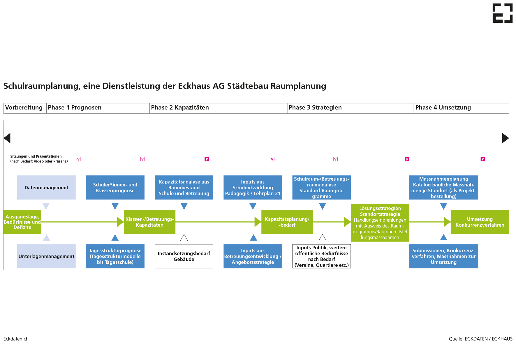 Kurz: Eckdaten ist Dienstleistung, Team, Netzwerk und Werkzeug zugleich. Wir betreuen und beraten Kantone, Städte, Gemeinden und Schulen bedarfsgerecht und unterstützen sie in der strategischen Schulraumplanung.
