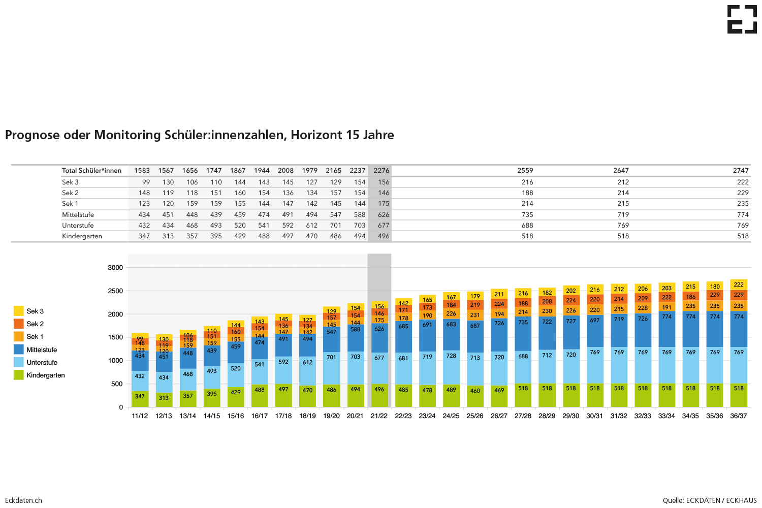 Eckdaten ist eine Dienstleistung der Eckhaus AG Städtebau Raumplanung. Ein interdisziplinäres Team begleitet Kunden in allen Bereichen der Schulraumplanung. Wir beleuchten mit den Auftraggebern zusammen die verschiedenen Bereiche Gesellschaft, Bildung, Demografie rund um die Volksschule und schulergänzende Betreuung. Für Prognosen zur Entwicklung der Schüler:innen- und Klassenzahlen und der Betreuungnachfrage stützen wir uns auf die firmeneigene Datenbank Eckdaten und das daraus entwickelte Tool eckdaten.app. Wir verfügen über ein gut ausgebautes Netzwerk mit Partner:innen aus den Bereichen Pädagogik, Architektur, Baumanagement sowie Data- und Software Engineering.