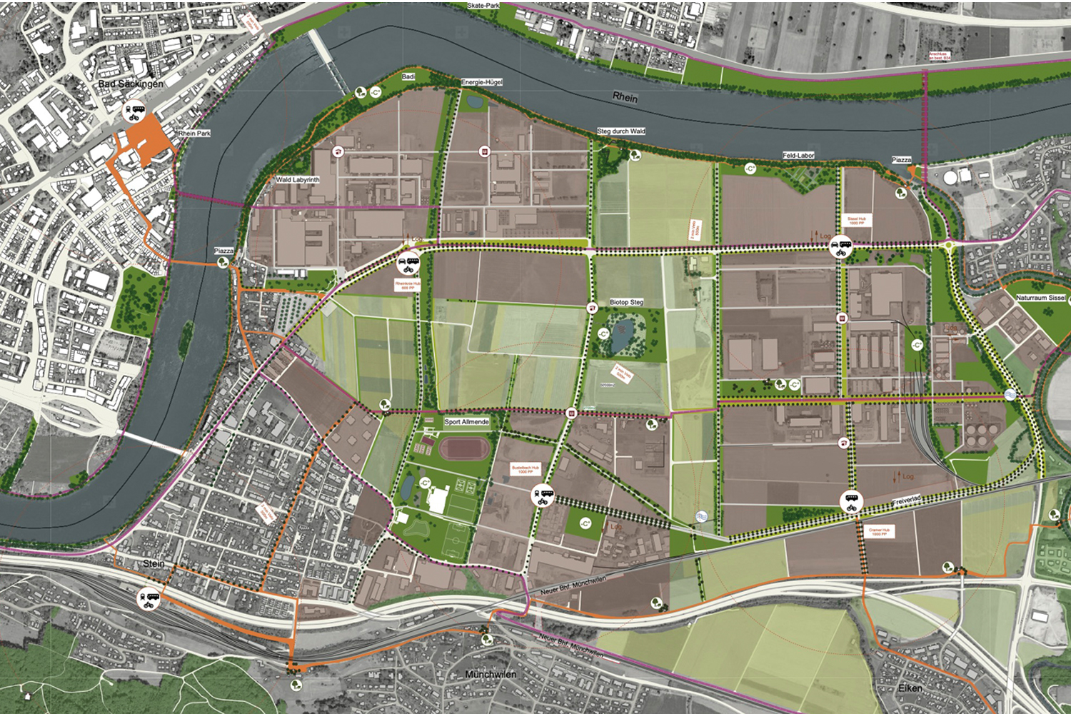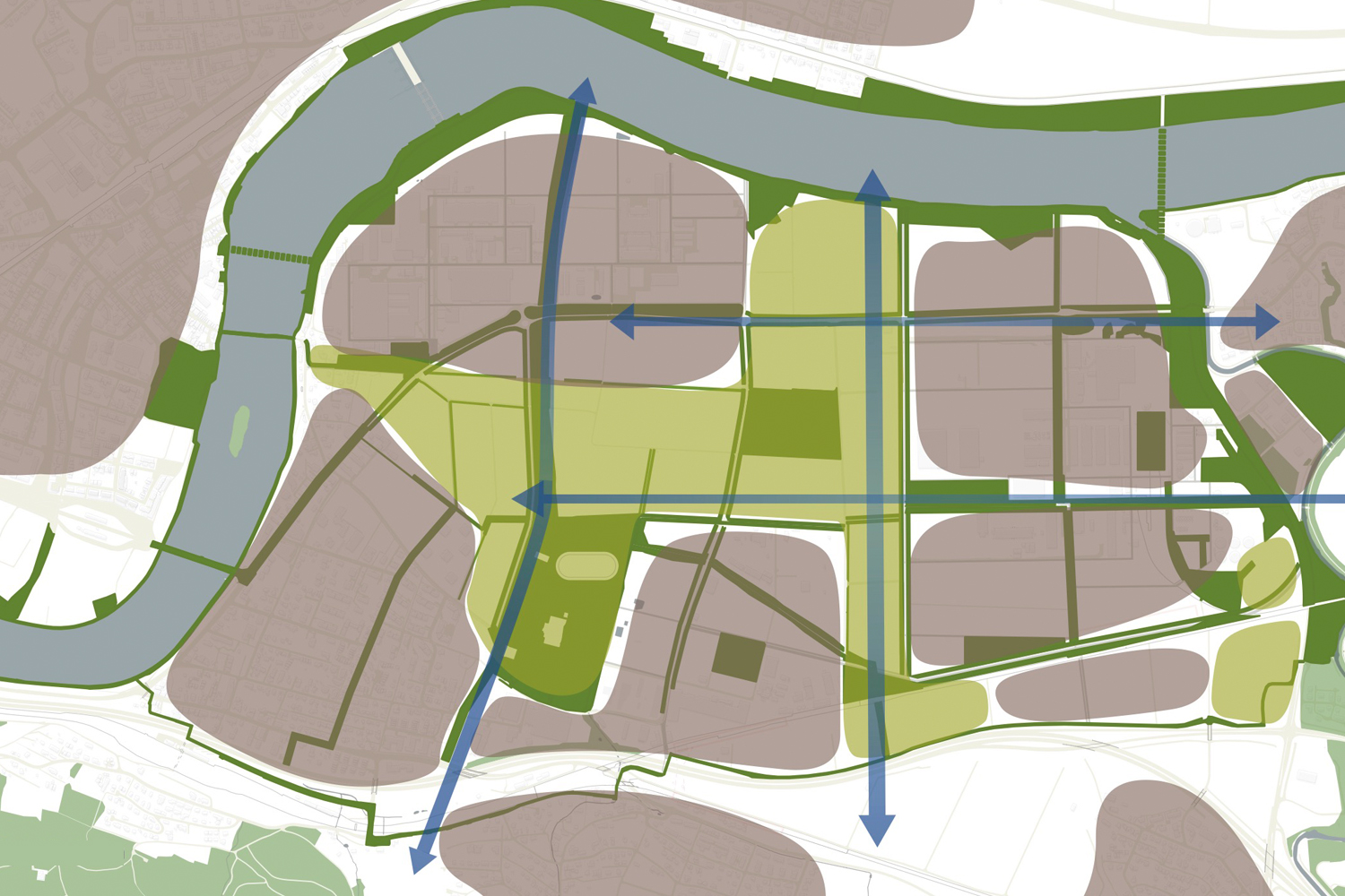 Das integrale Gesamtkonzept basiert auf der Etablierung eines grün-blauen Netzwerks welches die Landschaft strukturiert und gestaltet