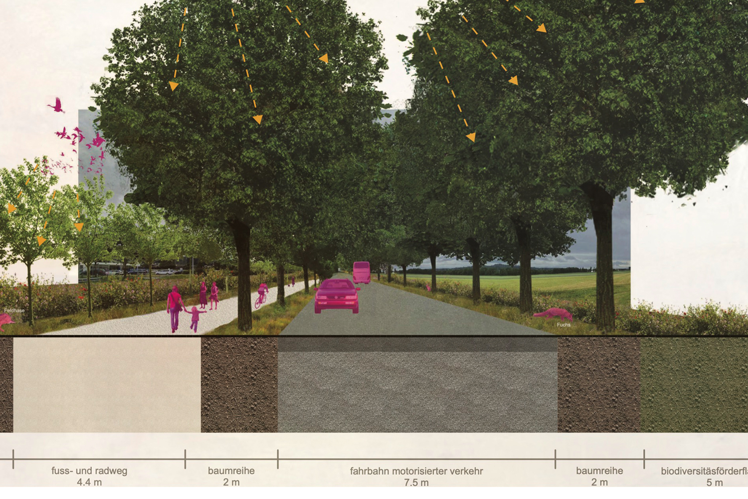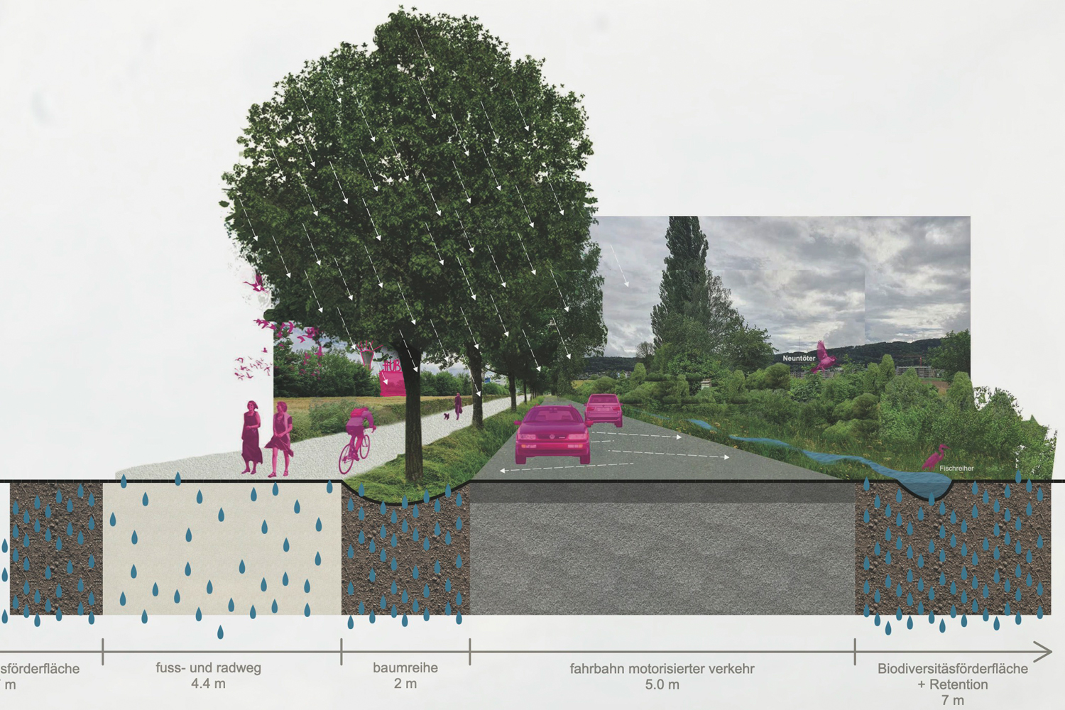 Profil Erschliessungsstrasse. Mobilitätsgerüst als Erlebnisraum und zur Förderung der ökologischen Vernetzung